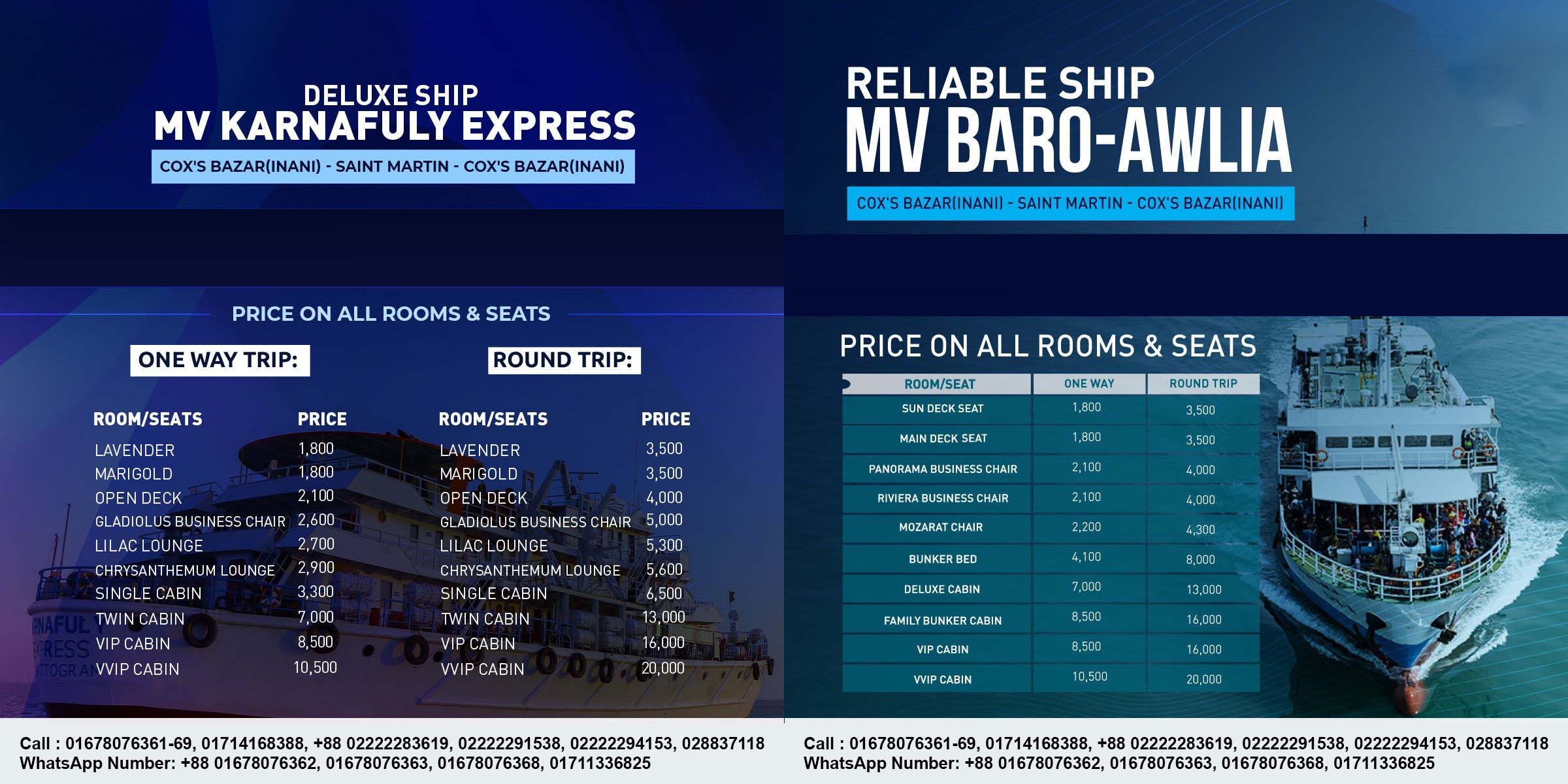 The MV Baro Awlia is a mid-sized, ocean-going cruise vessel that offers an affordable yet luxurious experience from Cox’s Bazar to Saint Martin. Fully air-conditioned and equipped with a range of premium amenities